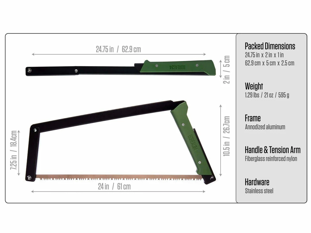 The BOREAL24 is a revolutionary 4 in folding bow saw that effortlessly unfolds in seconds for easy, high performance cuts. At 24 inches, the blade’s length is optimally sized for powerful sawing strokes, and yet short enough for packability. And the 3 hinged trapezium-shaped frame allows large diameter cuts. The blade safely fold into the frame when not in use, protecting you and your gear.