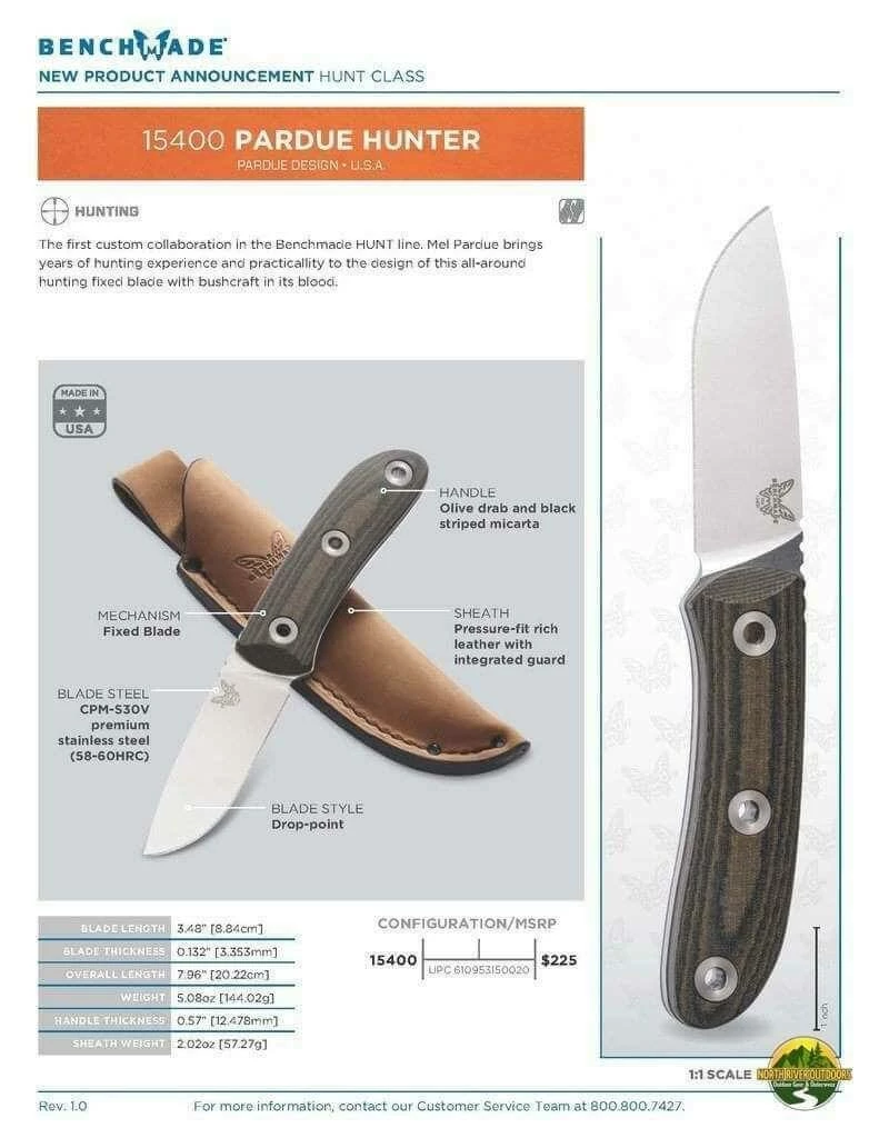 The Benchmade Pardue Hunter is a fixed blade design influenced by years of hunting experience. This all-around hunting fixed blade represents the first custom collaboration in the Benchmade HUNT line, and provides a practical platform for general outdoor use. The knife features a full-tang CPM-S30V stainless steel blade outfitted with comfortable olive drab/black striped micarta scales. The Pardue Hunter includes a pressure-fit leather sheath with an integrated guard for secure belt carry.