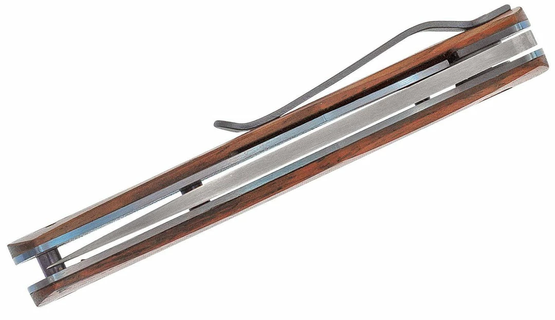 The huge success of the Exskelibur series based on Fred Burger’s and Mike Skellern’s design prompted Boker to think about how they could bring the series to the next level. The redesigned Exskelibur Damascus 2 Cocobolo features a stainless damascus blade with beautifully contrasting cocobolo handle scales, making it a collector’s piece with a particularly refined appeal. This is also matched by the blue-anodized titanium liner, giving the knife a unique flair. The knife has a liner lock and features a titanium pocket clip on the back side.