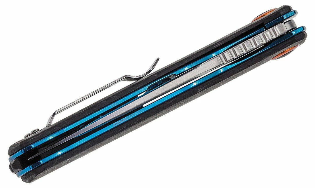 The smooth-running Boker Plus Nebula is a modern pocket knife for everyday use, equipped with pleasantly contoured handle scales made of wild carbon fibre. Blue anodised stainless steel liners and an orange ring around the black blade axle screw set a special colour accent. The satin-finished spearpoint blade in D2 is opened on ball bearings via thumb hole or flipper and reliably locked by a sturdy liner lock. An ergonomic finger recess and jimpings in the area of the thumb rest and on the black spacer made of G10 additionally increase work safety. With lanyard hole, clip (tip-up/r) and high-quality nylon case for storage.
