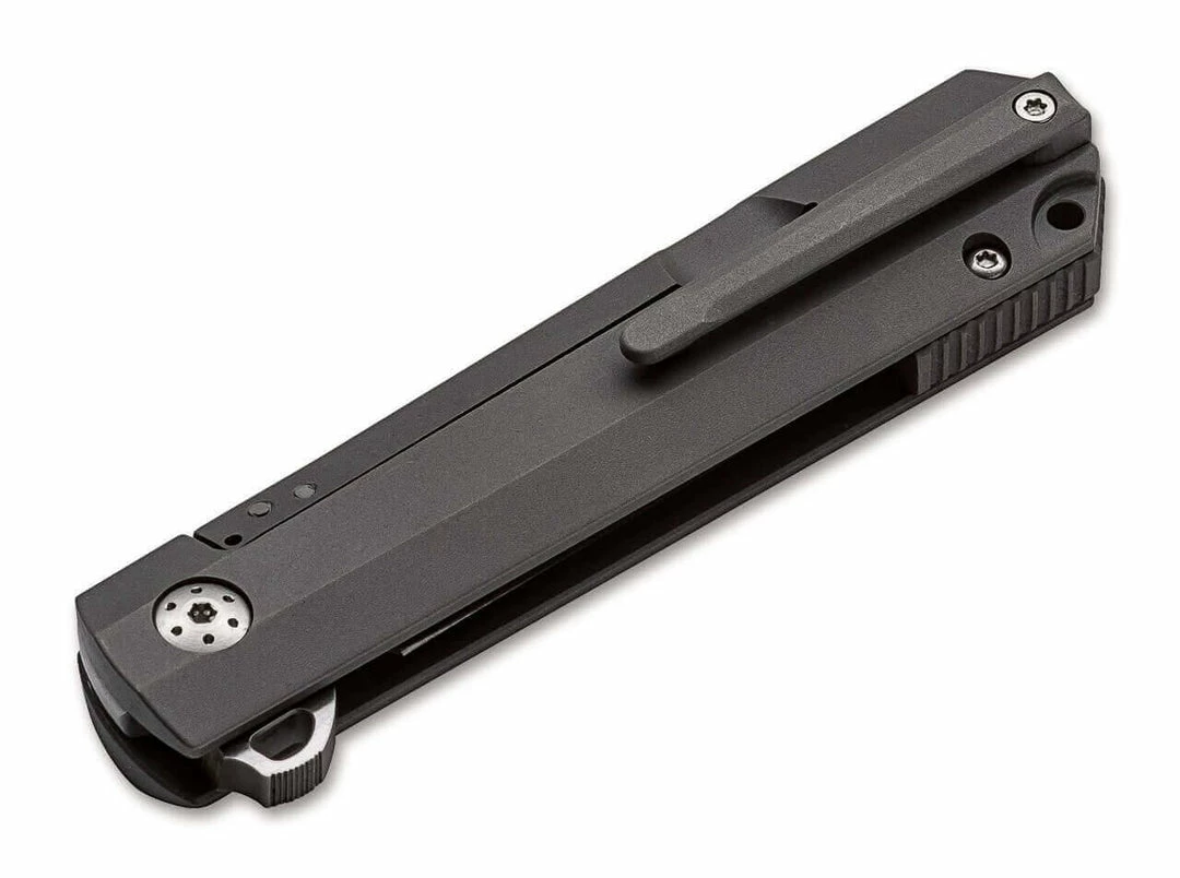 As a combination of a modern EDC and a high-quality gentleman’s knife, the Boker Plus Cataclyst convinces all along the line. The stable blade made of satin-finished D2 is opened by a ball bearing flipper and is provided with a flat grind and a double-sided groove. It is reliably locked by a reinforced Framelock. Jimpings in the area of the thumb rest and on the spacer further increase work safety. The straight-lined design is equipped with handle scales made of high-strength titanium, which are milled three-dimensionally and have weight-reducing recesses on the inside. The robust handle and deep-carry clip (tip-up/r), also milled from solid three-dimensionally, are finished with a matte beadblast finish. With lanyard hole and a high-quality nylon pouch for storage.