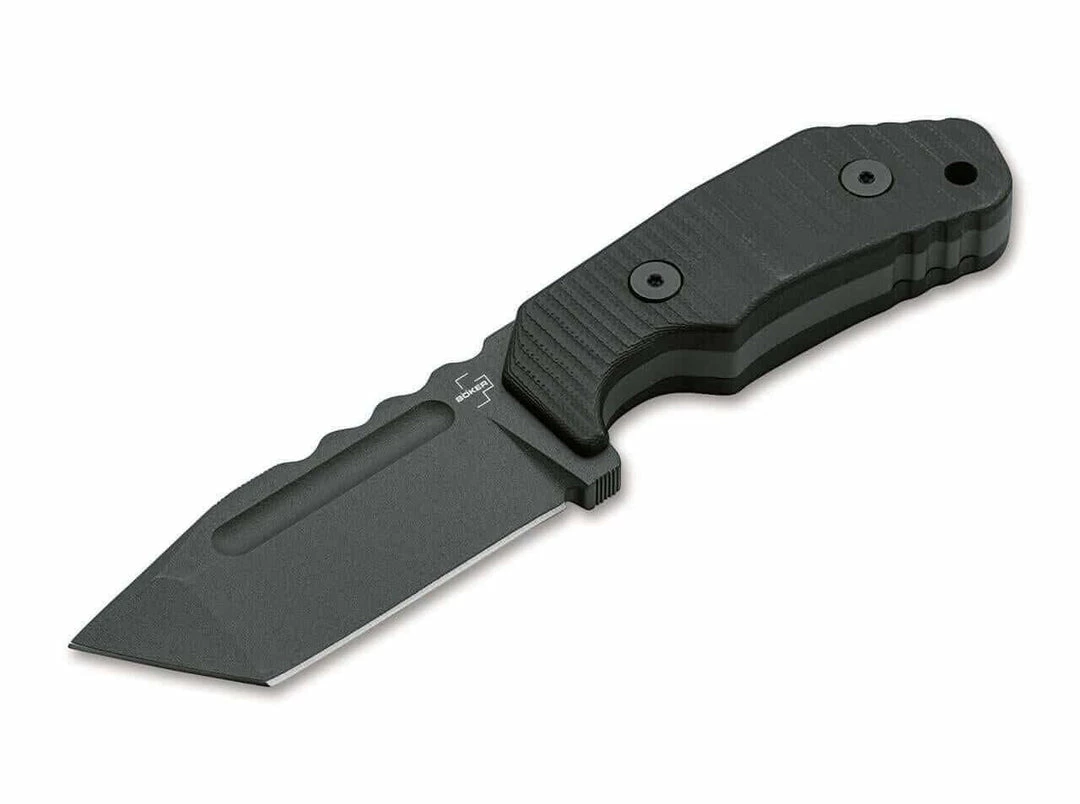 The fixed knife convinces with its compact size and a bulky Tanto blade made of D2, which is coated with a dark grey titanium coating and a pronounced hollow groove. The jimpings on the back of the blade promises a safe thumb rest for difficult cutting work. Despite the wrath of the gods, the well-shaped and partially serrated G10 handle always lies securely in the hand. Using a standard 3D printer, you can easily print out alternative handle scales in a wide variety of shapes, colours and materials yourself. Includes lanyard hole, belt clip and high-quality Kydex sheath