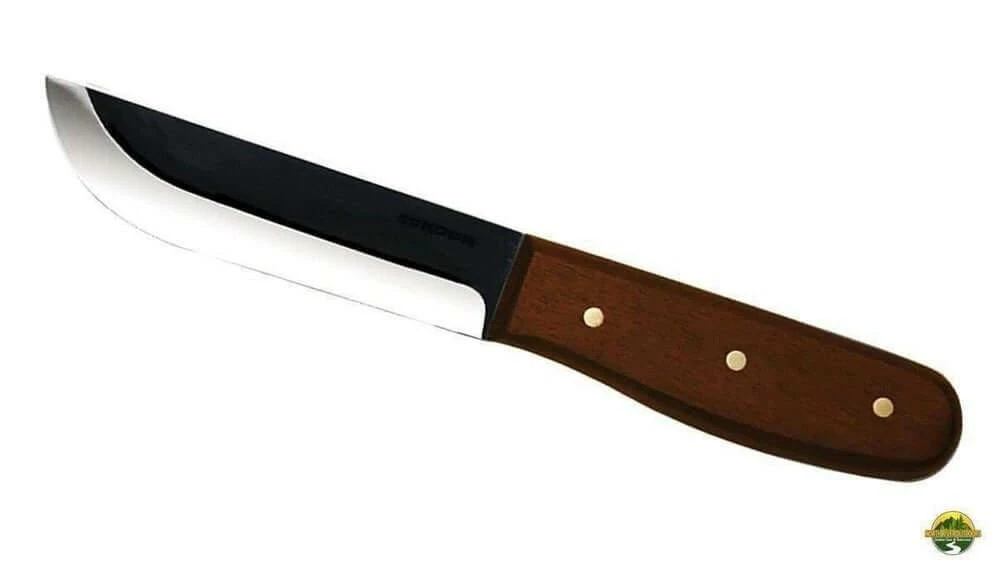 Condor Bushcraft 5″ Basic fixed blade is the largest of the three Condor Bushcraft knives. It has a Scandi ground 1075 high carbon steel blade. The two-tone finished blade is 3 mm thick and black epoxy powder coated. Hardwood scales are contoured for excellent grip and feel. The Bushcraft Basic knife comes with a brown leather sheath for belt carry.