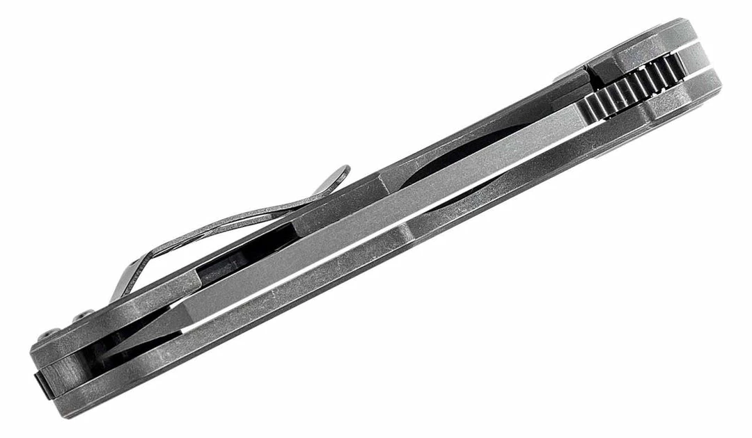 - Recessed titanium pocket clip with Curtiss Knives crosshairs logo and tip up carry.