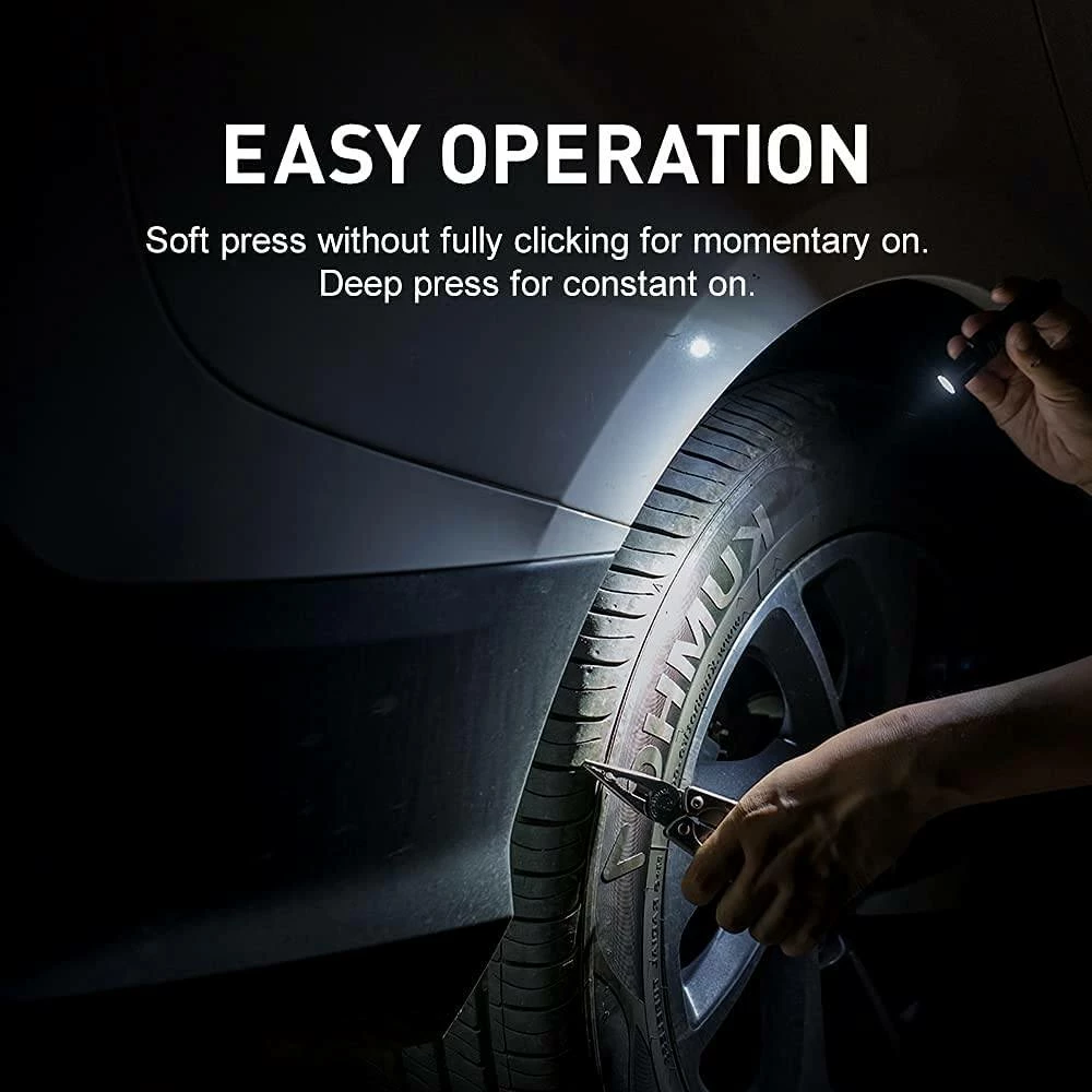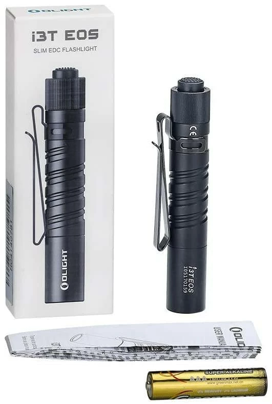 The Olight i3T EOS is a slim tail switch flashlight powered by a single AAA battery with a max output of 180 lumens. Its an excellent flashlight equipped with an high quality LED paired with a TIR optic lens producing a soft and balanced beam. It is also equipped with a dual direction pocket clip for multiple carrying options such as a pocket or backpack strap. The I3T is an incredibly convenient illumination experience to take with you everywhere.