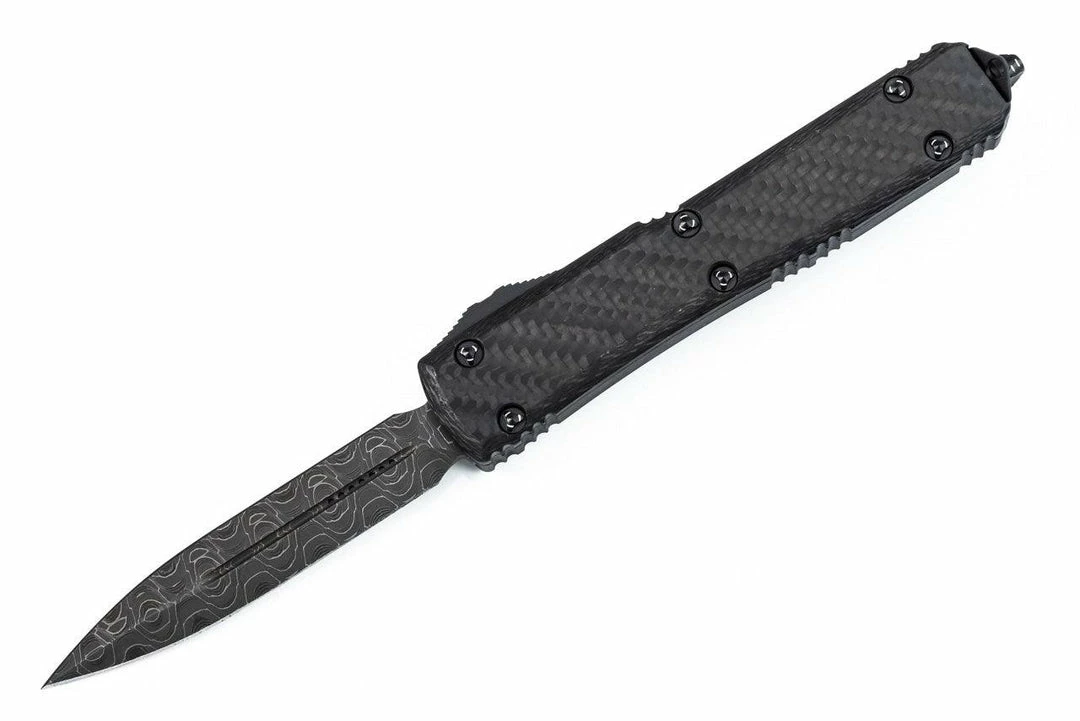 The Ultratech dual action out the front automatic knife from Microtech sets the standard for the category. Slim and lightweight enough for everyday carry but robust enough for hard tactical use, the Ultratech is a force to be reckoned with. This Signature Series version has a black contoured handle, plain Double Edge Damascus blade and bronze hardware.