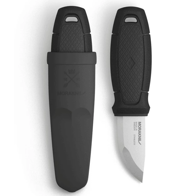 The blade is 2 mm thick and 56 mm long (or in this case short). It is made of high-quality Swedish stainless steel (12C27) that is treated to the highest quality in Morakniv’s factory. Add to this the convenient size of the blade, suitable for many outdoor tasks encountered on the hike as well as the camping or hunting trip. A secure grip of two different polymers and a click locks makes it safe to handle. Perfect for both new and more experienced explorers.