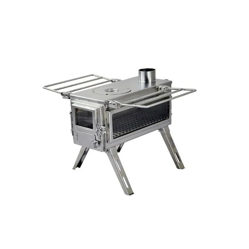 - Highly portable- Nesting legs and shelves fold flat to the stove body; 5 pipe sections, spark arrestor, and an ash scraper stow inside the stove body